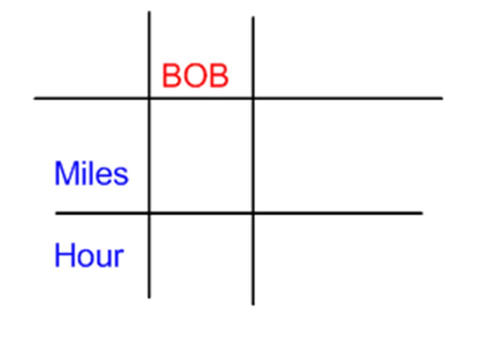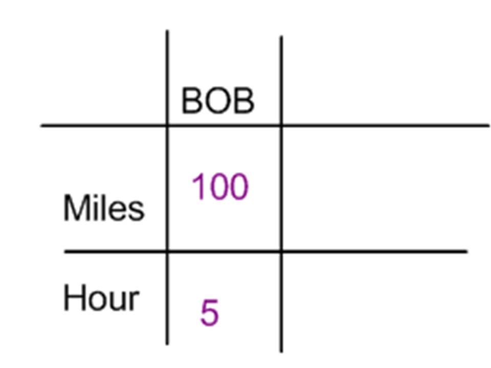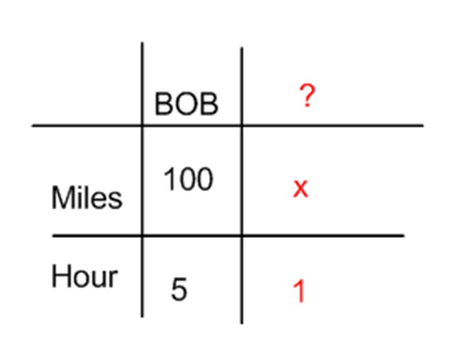 Ex. Bob drives 100 miles in 5 hours. How many miles does he travel every hour?